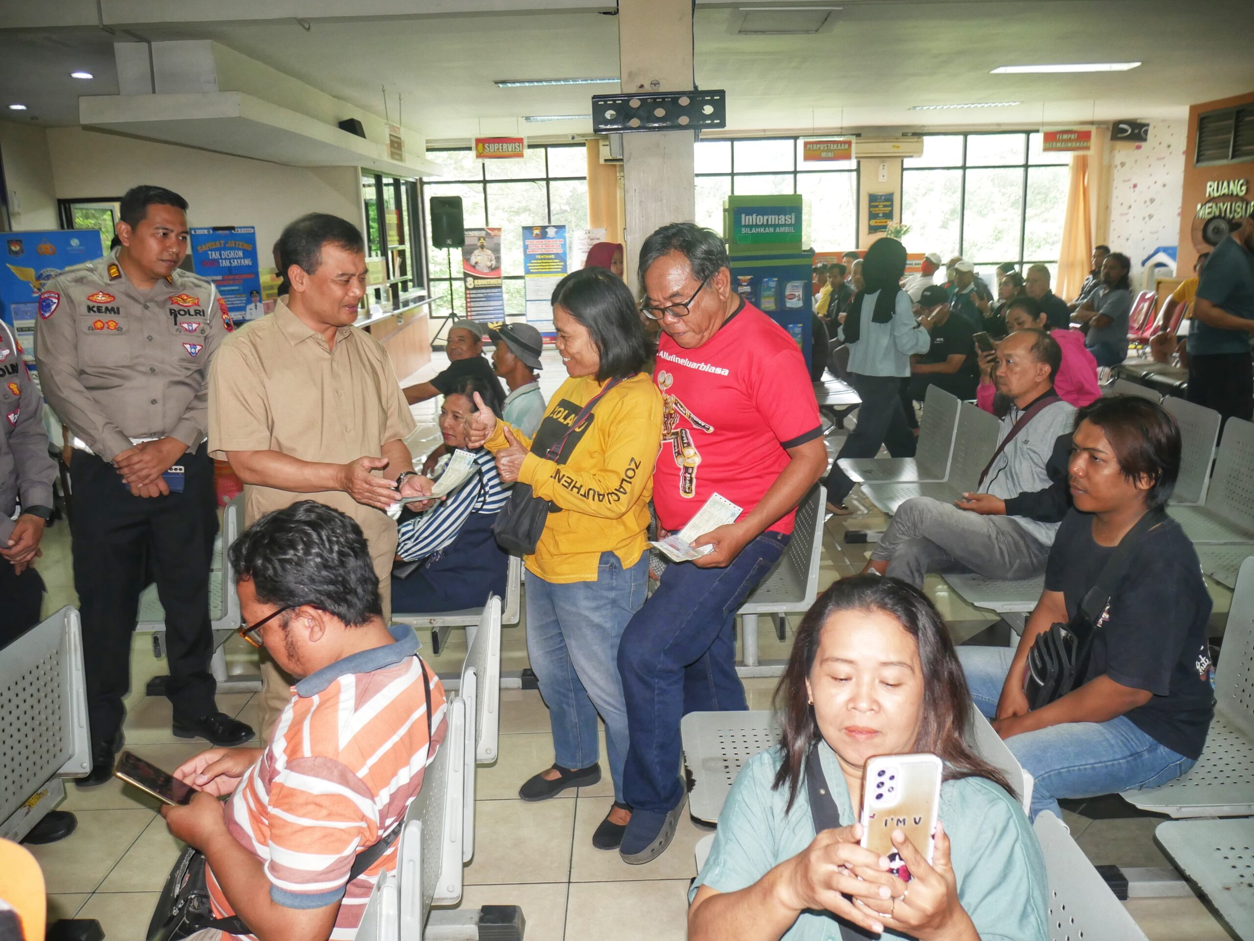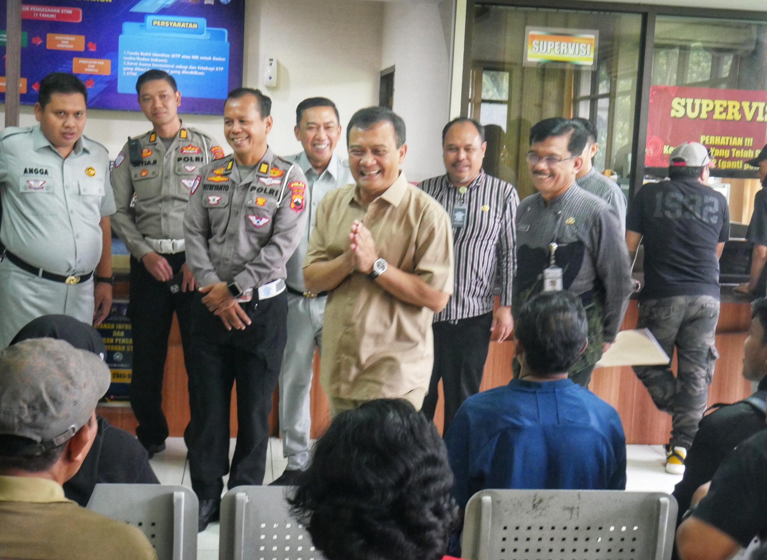 Sudiran tersipu malu namun nampak bahagia saat bertemu Gubernur Ahmad Luthfi di ruang tunggu Samsat Banyumanik II Kota Semarang. Sementara di tanganya masih memegang beberapa kertas yang akan dibawanya ke loket. Ia duduk di kursi menunggu panggilan petugas.